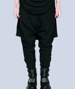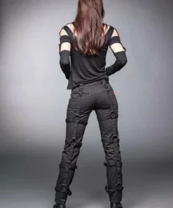 These low waist trousers have gothic themed design, front pockets, back zip pockets, belt loops detailing, a figure accentuating shape, d-ring details and it fastens with a zipper at the front.