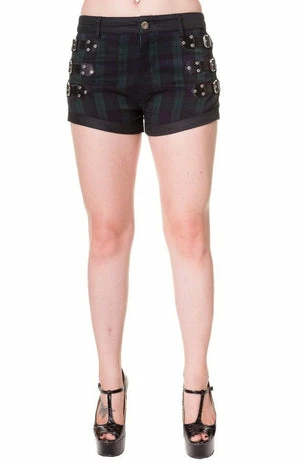 Tartan never looked so hot in these “Buckle” shorts from Banned. With tartan on the front, three buckles on each side and a black back. Available in red or green.