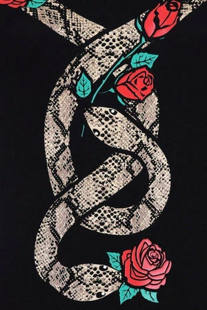 The mini dress has roses and serpent design, a round neckline, short sleeves and a figure accentuating shape.
