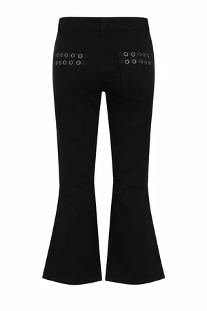 These medium waist trousers have d-ring detailing, flared bottoms, a figure accentuating shape and it fastens with a zipper at the front.
