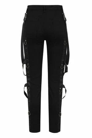 These high waist skinny trousers have gothic themed design, front pockets, back pockets, belt loops detailing, a figure accentuating shape, d-ring detailing and it fastens with a zip fly at the front.