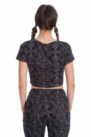 The top has Esoteric print, a crew neckline, short sleeves and a figure accentuating fit.