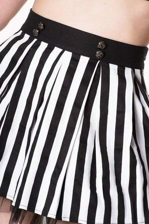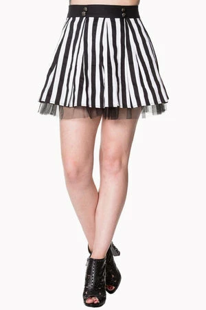 The mini skirt has white-black stripes print, buttons detail, pockets, tulle detail and a flattering shape.