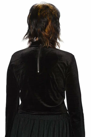 The gothic inspired black crop top has front keyhole cut out detail, a high neckline, full length flared sleeves, a figure accentuating fit and fastens with a zipper at the back.