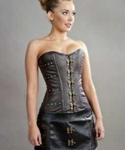 This C-Lock steampunk overbust, matte vinyl corset has brass studs, matte panels, brass c-lock fastening and back lace fastening with modesty panel.