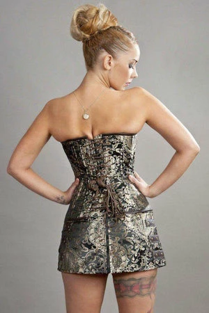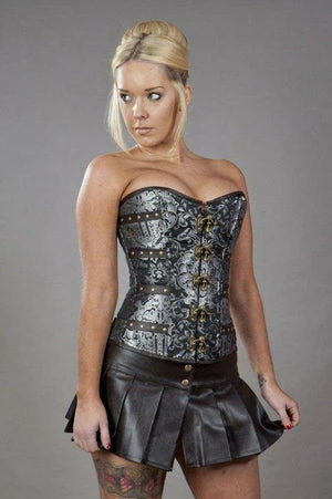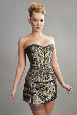 This C-Lock steampunk overbust corset in king brocade has brass studs, matte vinyl panels, brass c-lock fastening and back lace fastening with modesty panel.