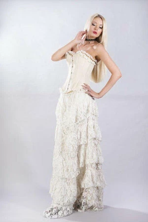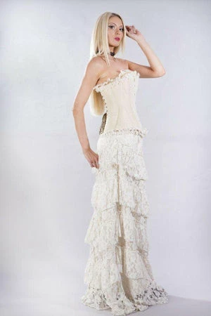 This Elizium overbust steel boned taffeta corset has clip fastening and back lace fastening with modesty panel.