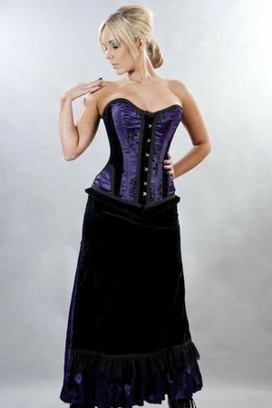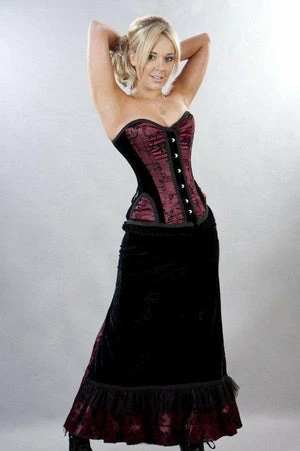 This Morgana long gothic victorian, satin skirt has black floral flock, black flock velvet panel with pockets, rear laced satin ribbon detail, a flattering fit and it fastens with a side zipper.