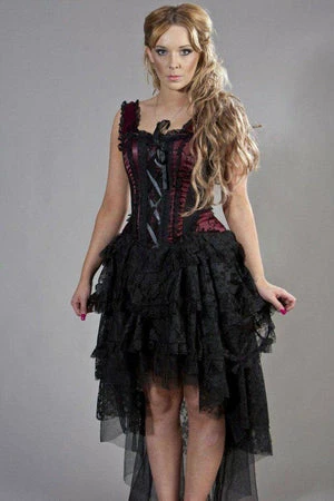 This satin, Victorian corset dress has black floral flock, lace frills, ribbon detail and back lace fastening with modesty panel.