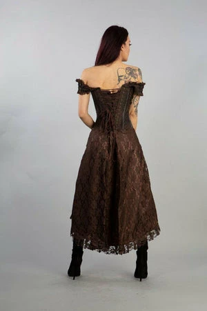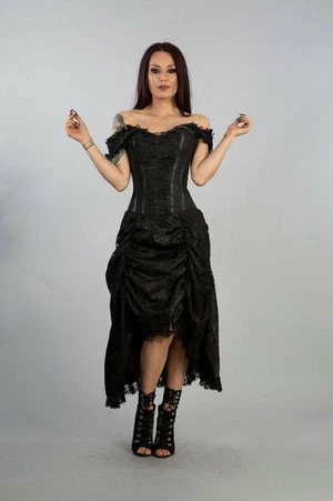 This Passion corset dress has black matt corset details, black king brocade and black satin lace overlay skirt with lace frill around and back lace fastening.