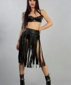 This Shredder knee length fringe black matte vinyl skirt has back zip fastening and a flattering fit.