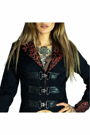 The long black cotton coat has red brocade details on the cuffs and collar and a buckle clasp fastening.