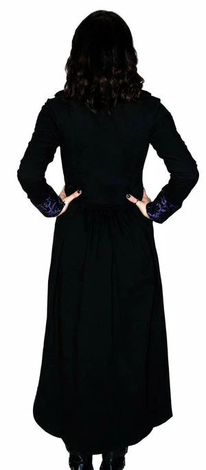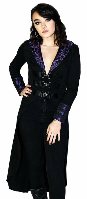 The black long cotton coat has purple brocade detailing and it fastens with a buckle clasp at the front.