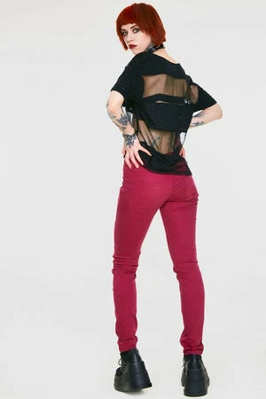 These burgundy coloured, punk style jeans from jawbreaker, have a skinny fit and are also available in other colours. They have front and back pockets and an embroidered detail over the back pocket, and are made in a stretchy soft cotton mix for a superb fit.