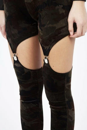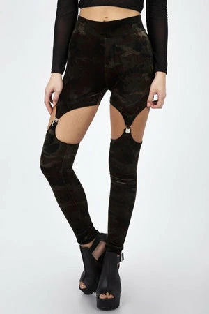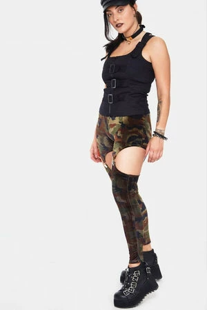 These military style leggings have a dark camouflage pattern, harness detail and a figure accentuating shape.