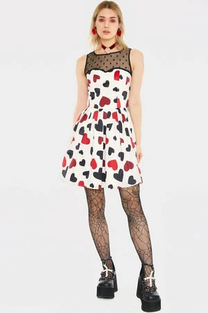 The sleeveless dress has an allover hearts print, patterned mesh neckline, a sweetheart neckline, pleated skirt, a flattering fit, back keyhole cutout with a button and it fastens with a hidden zip at the back.