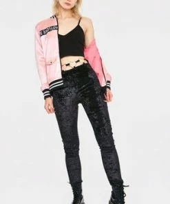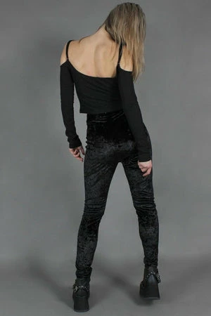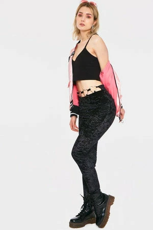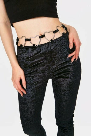 These dark velvet leggings have metal hearts detailing and a figure accentuating shape.