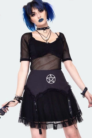 The mini high waisted skirt has Pentagram embroidered design, net overlay, suspender belt detail, ruffle hem mesh layer detail and a flattering fit.