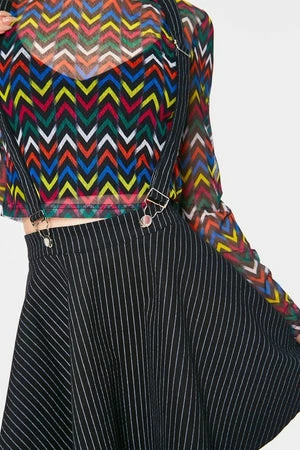 This A-line mini pin striped skirt has detachable suspenders detailing and a flattering fit.