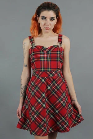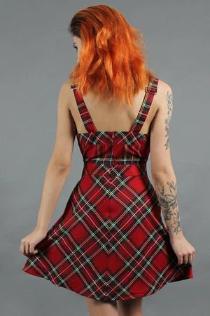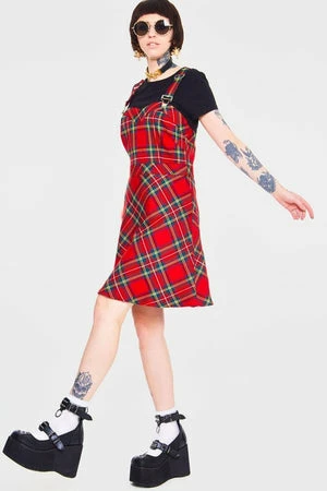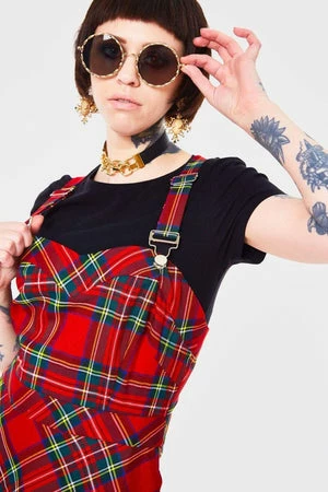 The dungaree style mini dress has red-tartan print, a sweetheart neckline, a figure accentuating shape, adjustable straps and it fastens with a zipper at the center back.