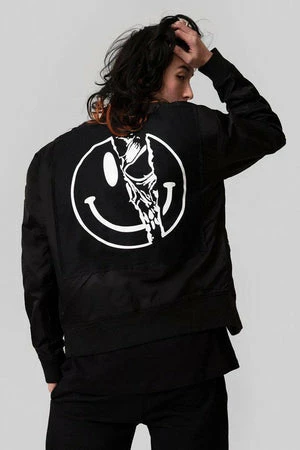 The jacket has ‘Killer Smiley‘ back print, neckline and hem ribbed cuffs, a regular fit and it fastens at the front with a zipper.