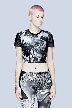 This is a killer black crop top design from Long Clothing, made in collaboration with “Pussykrew”, the post-human, experimental gothic art team from Poland.