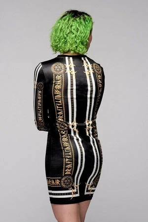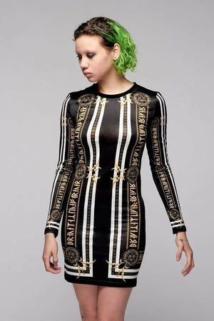 This is a wicked, black, white and gold bodycon dress from Long Clothing called “Stay Gold”, which is embellished with fearsome tribal style details and runic writing.