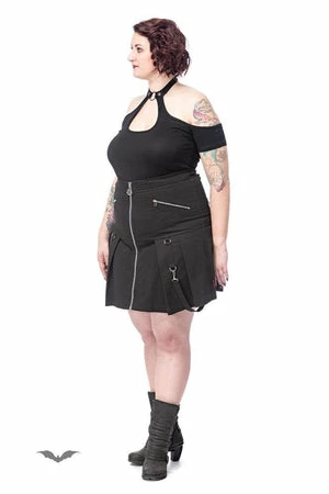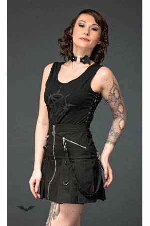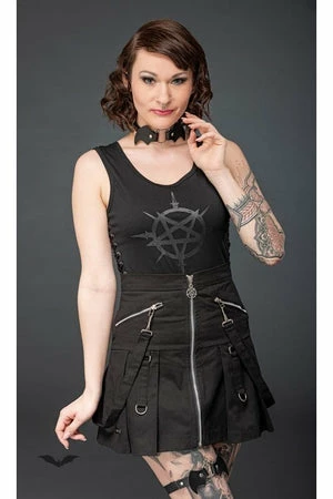 A stunning fashion statement, this skirt has a pentagram zip down the front with a pocket on each side and clip-on ribbons that can be removed. A wicked design for a night out on the town.